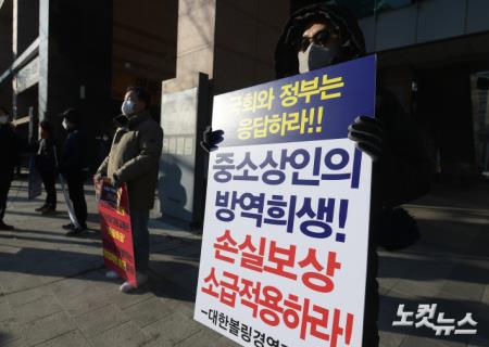 '거리두기 단계 개편을 위한 공개토론회'가 열린 2일 서울 중구 LW컨벤션 앞에서 자영업자들이 1인 시위를 나서며 영업시간 연장 등을 촉구하고 있다.