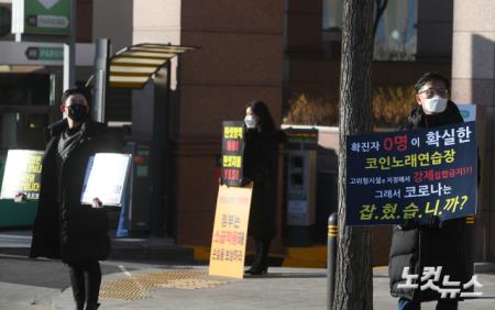 거리두기 개편 공개토론회 앞 1인 시위 나서는 자영업자들