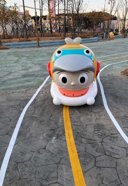 유아들에게 가장 인기를 끌 콘텐츠로 주목받는 테마파크 야외에 설치된 탑승 로봇 '노리원'은 인공지능 탑재로 탑승객과 소통을 할 수 있다. 최대 2명까지 탑승해 어드밴처존에서 퓨처존까지 목적지를 설정해 자율주행으로 이동한다.