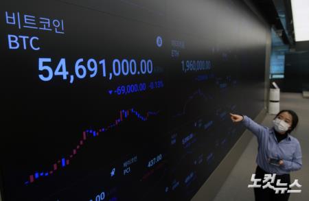 17일 서울 강남구 암호화폐 거래소 업비트 라운지에 설치된 시세 전광판에 비트코인 시세가 표시돼있다. 전날 16일(GMT 기준) 가상화폐 비트코인이 한때 사상 최고가인 5만달러(약 5510만원)를 넘겼다.