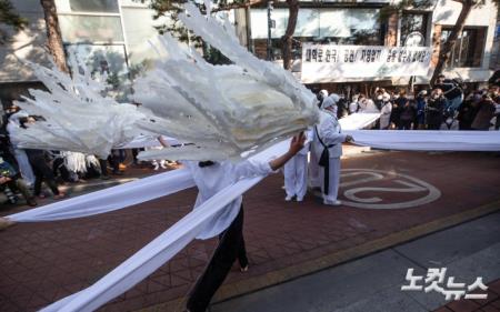 한국민족춤협회가 19일 오전 서울 종로구 대학로 소나무길에서 열린 고(故) 백기완 통일문제연구소 소장 노제에서 집단무를 하고 있다.