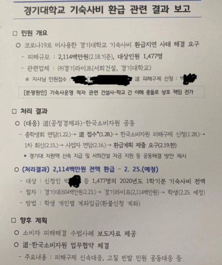 그 결과 경기대와 기숙사 운영사인 (주)경기라이프는 '오는 25일까지 학생들에게 비사용 기간의 기숙사비를 전액 환급하겠다'는 내용의 확약 공문을 최근 도에 제출한 것으로 확인됐다.