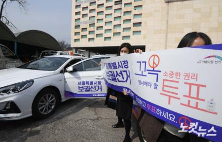 서울특별시선거관리위원회가 3일 서울 성북구 대왕 기업 택시 차고지에서 보궐선거일을 알리고 유권자의 투표참여를 독려하기 위해 택시에 홍보 래핑을 실시하고 있다.