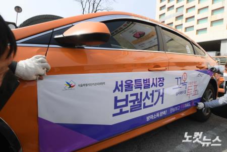 서울특별시선거관리위원회가 3일 서울 성북구 대왕 기업 택시 차고지에서 보궐선거일을 알리고 유권자의 투표참여를 독려하기 위해 택시에 홍보 래핑을 실시하고 있다.