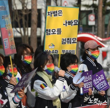 8일 오후 서울 중구 서울시청 앞에서 열린 성소수자 부모모임 '살아있자, 누구든 살아있자' 기자회견에서 참석자들이 손 피켓을 들고 있다.
