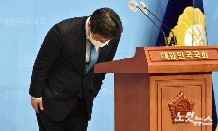 부동산 투기 의혹을 받는 서영석 더불어민주당 의원이 16일 국회 소통관에서 언론보도에 대한 입장발표 후 국민 앞 고개숙여 인사하고 있다.