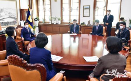 박병석 국회의장이 17일 국회의원 부동산 투기 전수조사 신속 추진을 위한 비교섭단체 소속 의원들 개인정보제공 동의서를 전달하기 위해 국회 의장실을 찾은 강은미 정의당 비상대책위원장-강민정 열린민주당 원내대표-용혜인 기본소득당 의원-조정훈 시대전환 대표와 대화를 나누고 있다.