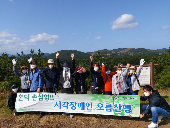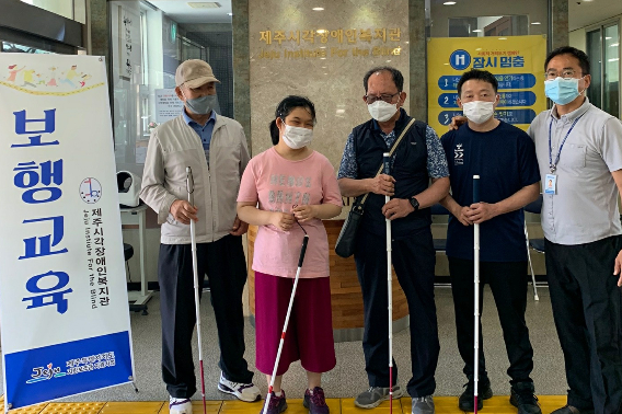 보행교육에 참여한 시각장애인들이 기념촬영을 하고 있다. 제주시각장애인복지관 제공