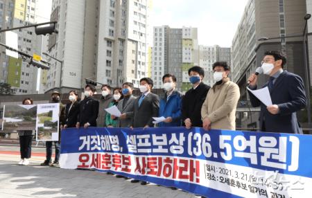 21일 오후 더불어민주당 야당후보검증 태스크포스(TF)팀이 오세훈 서울시장 재임 시절 당시 처가가 소유한 내곡동 땅 부지가 국민임대주택지구 부지로 지정돼 36억원의 보상을 받았다는 의혹이 제기된 내곡동 주택지구를 둘러 본 후, 천준호 의원이 발언을 하고 있다.