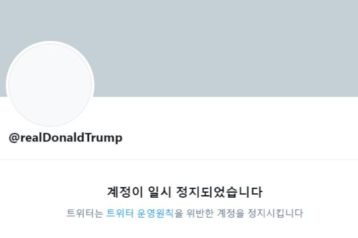 계정이 일시 정지된 도널드 트럼프 전 미국 대통령의 트위터 계정. 트위터 캡처