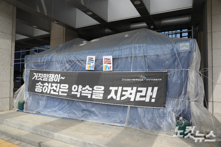 민주노총 공공운수 노조는 지난해 10월쯤 공무직으로 전환된 청소노동자들의 처우 개선을 요구하며 천막을 설치하고 단식 농성 등 쟁의행위에 돌입했다.