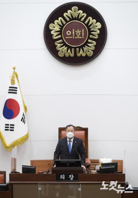 김인호 서울시의회 의장이 19일 오후 서울 중구 서울특별시의회 본회의장에서 열린 '제300회 시의회 임시회 개회식'에 참석해 개회사를 하고 있다.