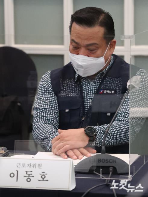 20일 오후 서울 중구 한국프레스센터에서 최저임금을 심의, 의결하는 기구인 최저임금위원회가 내년도 최저임금 결정을 위해 올해 첫 전원회의를 열고 있다. 회의에 참석한 이동호 근로자위원이 두 손을 모으고 있다.