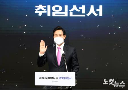 오세훈 서울시장이 22일 오전 서울 동대문구 동대문디자인플라자에서 온라인 취임식을 갖고 취임선서를 하고 있다.