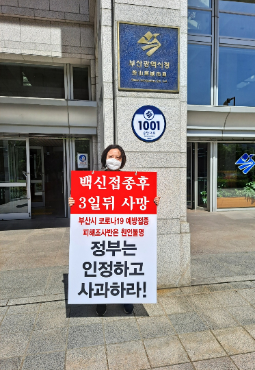 백신접종 후 사망한 82세 여성 A씨의 딸 B씨에 따르면, B씨는 26일 오전 부산시청 앞에서 어머니의 죽음과 백신접종과의 인과관계를 주장하며 1인 시위를 벌였다.
