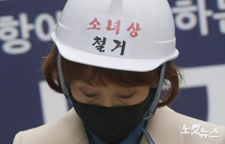28일 서울 종로구 옛 일본대사관 앞에서 열린 '비엔나 협약 위반 소녀상 철거 기자회견' 에서 위안부법폐지국민행동 등 보수단체 회원들이 손 피켓을 들고 있다. 있다.