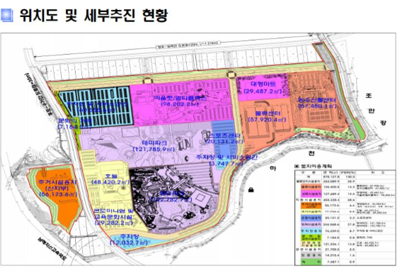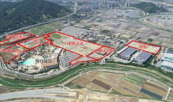 건설을 완료한 스포츠센터를 제외하고 테마파트 23%, 호텔 4%, 콘도 5%, 종업원숙소는 5개동 중 1개동 완료, 대형마트 9%에 불과하다. 사실상 공사를 중단한 셈이다.