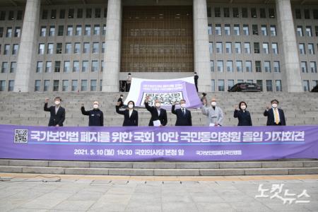 10일 국회 본청 앞에서 열린 ‘국가보안법폐지 10만 국민동의청원 돌입 선포 기자회견’에서 참가자들이 보안법 폐지를 촉구하는 구호를 외치고 있다.