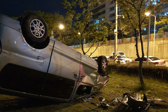 A씨 차량은 인근 공원으로 돌진해 나무를 들이받고 뒤집힌 뒤에야 멈췄다.