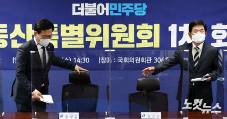 더불어민주당 송영길 대표와 김진표 부동산특별위원회 위원장이 12일 오후 국회 의원회관에서 열린 부동산특별위원회 회의에 나란히 자리하고 있다.