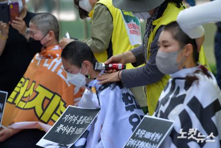 홈플러스 여성노동자들이 13일 서울 광화문 디타워 MBK 앞에서 운영사 MBK파트너스의 주요 점포 폐점 매각을 규탄하며 집단삭발을 하고 있다.