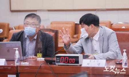 참고인 신분으로 출석한 법무법인 가로수 김필성 변호사, 서민 단국대학교 교수가 26일 오후 서울 여의도 국회 법제사법위원회에서 열린 김오수 검찰총장 후보자에 대한 인사청문회에서 대화를 나누고 있다.