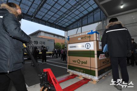 코로나19 모더나 백신의 첫 번째 도입물량인 5만5000회분이 1일 충북 청주시의 GC녹십자 오창공장에 입고되고 있다. 국내에서는 GC녹십자가 모더나 백신의 유통을 담당하고 있다. 모더나 백신은 국가출하 승인 절차를 거친 뒤 이달 중순부터 병원급 이상 의료기관의 30세 미만 종사자에게 접종된다.