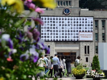 4일 서울 중구 서울도서관 외벽에 6월 호국보훈의 달을 맞아 '마지막 한 분까지 기억하겠습니다'라는 문구가 담긴 꿈새김판이 전시되고 있다. 꿈새김판에는 라미 현 작가가 2017년부터 ‘프로젝트 솔져’를 진행해 찍은 전국 각지와 미국, 영국, 프랑스, 네덜란드 등 생존한 6·25전쟁 참전용사 131명의 흑백 사진이 문구와 함께 전시된다.