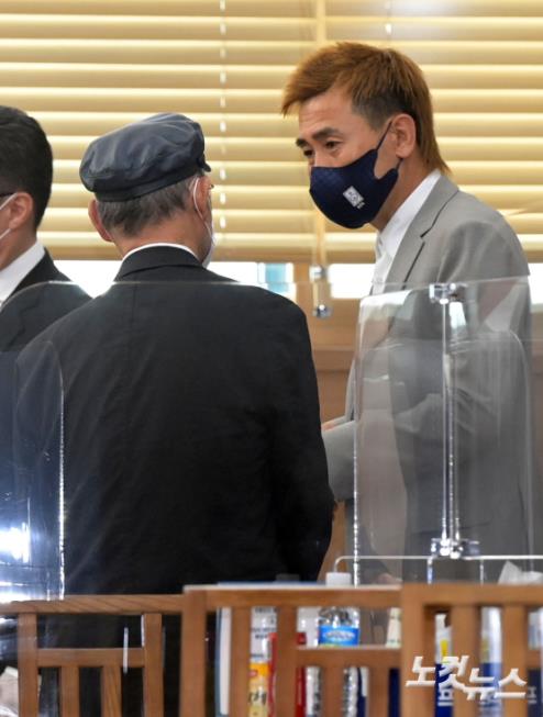 김병지 전 축구선수가 8일 서울 아산병원 장례식장에 마련된 故 유상철 전 감독의 빈소에서 관계자와 대화를 하고 있다.