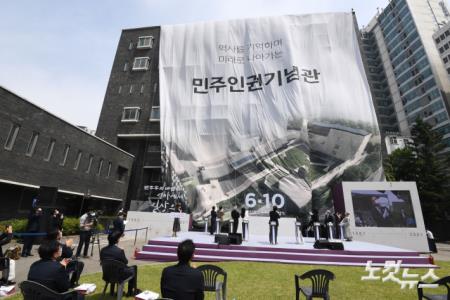 제34주년 6·10 민주항쟁 기념식이 열린 10일 서울시 용산구 민주인권기념관에서 옛 남영동 대공분실 자리에 새로 세워지는 민주인권기념관 착공 행사가 진행되고 있다.