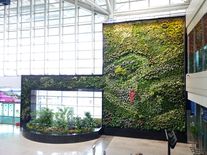 실내정원은 여객청사 국제선 로비 1층과 국내선 도착장 1층에 수직정원 290㎡와 평면조경 20㎡ 규모로 고무나무 등 상록 관엽식물 49종 만 3156그루를 심어 사계절 푸르름이 가득한 공간으로 변했다.