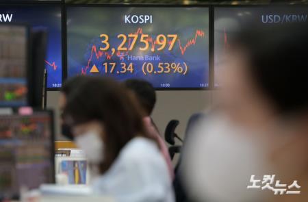 코스피가 사상 최고치를 경신한 16일 서울 중구 하나은행 딜링룸 전광판에 코스피 지수가 전 개리일 17.34(0.53%) 오른 3,275.97로 나타나내고 있다.