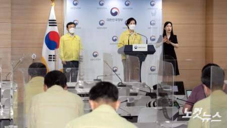 유은혜 사회부총리 겸 교육부 장관과 권덕철 보건복지부 장관이 20일 서울 종로구 세종대로 정부서울청사에서 코로나19 중앙재난안전대책본부 정례브리핑을 하고 있다. 이날 유 부총리는 2학기 전면 등교를 위한 이행 방안 등을 발표했다.