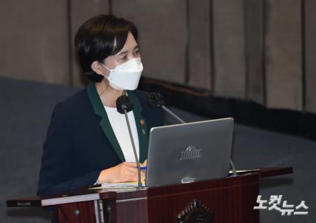 유은혜 사회부총리 겸 교육부 장관이 24일 국회 본회의 교육·사회·문화 분야 대정부질문에서 유기홍 더불어민주당 의원 질의에 답하고 있다.