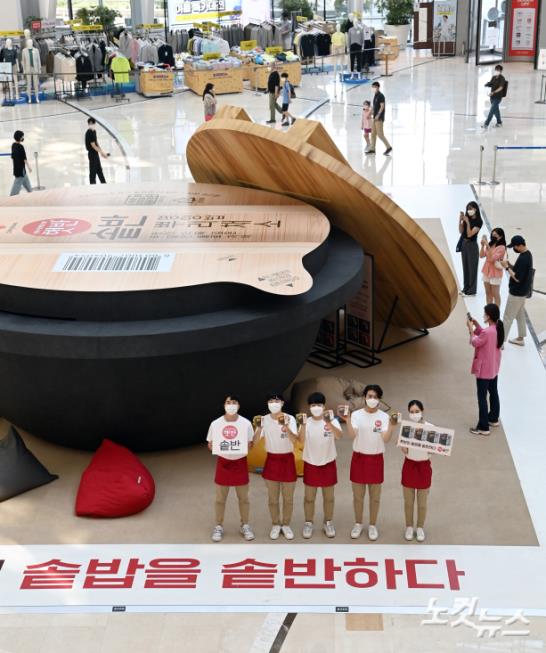 27일 오전 서울 영등포 타임스퀘어 메인광장에서 CJ제일제당이 신제품 햇반솥반을 소비자에게 알리기 위해 연 초대형 솥과 솥밥 주걱을 활용한 팝업 전시가 진행되고 있다.