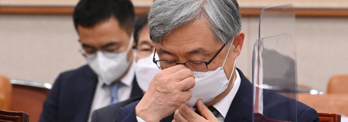 최재형 감사원장이 마스크를 고쳐쓰고 있다. 윤창원 기자