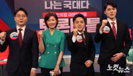 30일 서울 중구 TV조선 스튜디오에서 열린 국민의힘 대변인 선발을 위한 토론 배틀 '나는 국대다(국민의힘 대변인이다)' 4강에 오른 신인규(왼쪽부터), 김연주, 임승호, 양준우 후보가 기념촬영을 하고 있다.