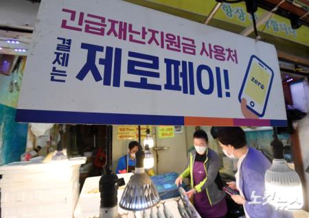 '1인당 25만원' 씩을 받는 코로나19 상생 국민 지원금(5차 재난지원금) 신청이 지난 6일 시작된 가운데 7일 오후 서울 서대문구 영천시장에 '재난 지원금 사용 가능' 안내문이 붙어 있다.