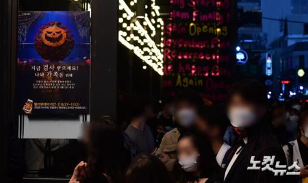 핼러윈 데이를 하루 앞둔 30일 오후 서울 용산구 이태원 세계음식거리에 핼러윈 데이 기간 코로나19 선제검사를 권고하는 포스터가 부착돼 있다.