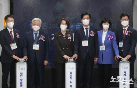 임혜숙 과학기술정보통신부 장관(왼쪽 세번째)이 24일 서울 종로구 알뜰폰 스퀘어에서 열린 '알뜰폰 1천만 가입자 달성 및 도입 11주년 기념행사'에서 참석자들과 세레머니를 하고 있다. (왼쪽부터 박종석 우정사업본부 본부장, 김형진 한국알뜰통신사업자협회장, 임 장관, 더불어민주당 조승래 의원, 무소속 양정숙 의원, 국민의힘 김영식 의원)