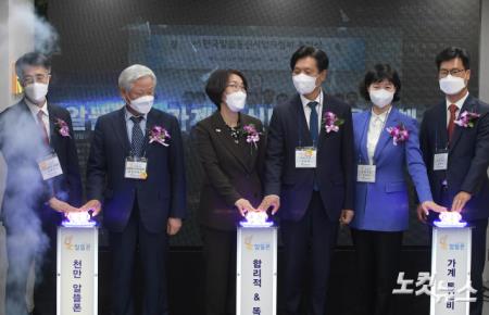 임혜숙 과학기술정보통신부 장관(왼쪽 세번째)이 24일 서울 종로구 알뜰폰 스퀘어에서 열린 '알뜰폰 1천만 가입자 달성 및 도입 11주년 기념행사'에서 참석자들과 세레머니를 하고 있다. (왼쪽부터 박종석 우정사업본부 본부장, 김형진 한국알뜰통신사업자협회장, 임 장관, 더불어민주당 조승래 의원, 무소속 양정숙 의원, 국민의힘 김영식 의원)