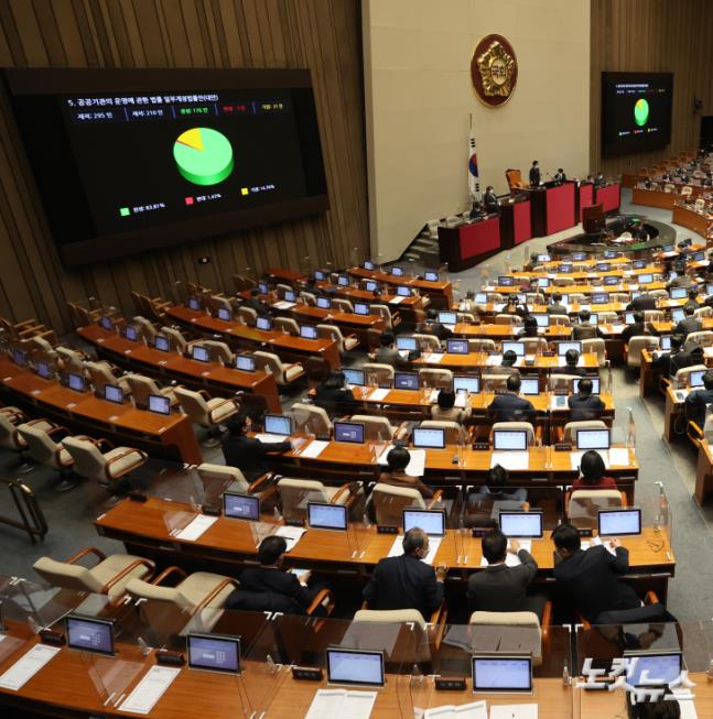 11일 국회에서 열린 새해 첫 본회의에서 노동자 대표가 공공기관 이사회의 의사결정 과정에 참여할 수 있도록 하는 내용의 '공공기관 운영에 관한 법률 일부개정법률안'(노동이사제)이 통과되고 있다.