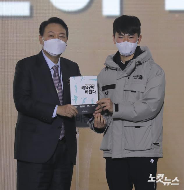 윤석열 국민의힘 대선후보가 25일 서울 송파구 올림픽공원 SK올림픽핸드볼경기장에서 열린 2022 대한민국체육인대회에 참석해 '체육인이 바란다' 책자를 전달받고 있다.