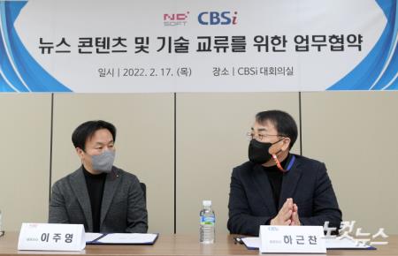 ND소프트 이주영 대표(왼쪽)와 CBSi 하근찬 대표가 17일 오후 서울 양천구 CBSi 회의실에서 열린 'ND소프트-CBSi 뉴스 콘텐츠 및 기술 교류를 위한 업무협약식'에 참석해 협약서에 대화를 하고 있다. 양사는 이번 업무 협약으로 “콘텐츠 및 기술의 상호 교류를 통해 고객 만족을 높이고 서비스를 확장할 계획”이며 “더 나아가 콘텐츠를 정당하게 사용하는 환경을 조성하기 위해 협력할 것”이라고 밝혔다.