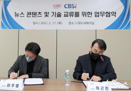 ND소프트 이주영 대표(왼쪽)와 CBSi 하근찬 대표가 17일 오후 서울 양천구 CBSi 회의실에서 열린 'ND소프트-CBSi 뉴스 콘텐츠 및 기술 교류를 위한 업무협약식'에 참석해 협약서에 서명을 하고 있다. 양사는 이번 업무 협약으로 “콘텐츠 및 기술의 상호 교류를 통해 고객 만족을 높이고 서비스를 확장할 계획”이며 “더 나아가 콘텐츠를 정당하게 사용하는 환경을 조성하기 위해 협력할 것”이라고 밝혔다.