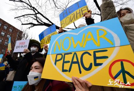 28일 오전 서울 중구 주한 러시아 대사관 앞에서 열린 ‘러시아의 우크라이나 침공 중단·평화적 해결 촉구 시민사회 공동 기자회견’에 참석자들이 손피켓을 들어보이고 있다.