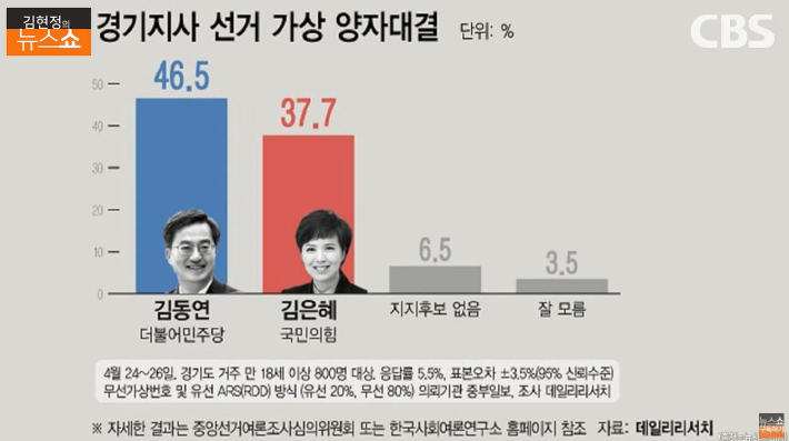 ◇ 김현정> 알겠습니다. 이번 주 들어서 정가가 주목하는 좀 흥미로운 부분이 뭐냐면요. 각 당에, 양 당의 최종 후보가 확정되기 전에 여론조사와 확정된 후의 여론조사 결과가 달라졌다는 거예요. 물론 여론조사라는 게 오차 범위 내에서 들쑥날쑥 하기 마련이지만 이거는 좀 차이가 크더라고요. 보면 데일리리서치가 지난 24일부터 26일까지 경기도 성인 800명 대상으로 실시한 여론조사. 김동연 후보 46.5%, 김은혜 후보 37.7%가 나왔는데 경선 전까지만 해도 김동연 대 김은혜, 김동연 대 유승민 했을 때 김은혜 후보는 이기고 유승민 후보는 김동연 후보한테 지는 걸로 나왔었거든요. 이거 변화의 이유가 뭐라고 보십니까?