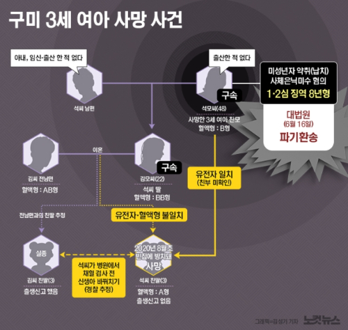 어제 오전 대법원발 속보가 하나 나왔습니다. 세간을 떠들썩하게 했던 구미 3세 여아 사망사건. 아이가 방치된 채 숨졌는데 처음에는 그 아이의 외할머니인줄 알았던 사람이 친모로 밝혀지면서 충격을 줬던 그 사건이죠. 수사 당국의 결론은 외할머니 석 씨가 비슷한 시기에 딸이 낳은 아이하고 자신이 낳은 아이를 바꿔치기 했고 바꿔치기 당한 석 씨 아이가 숨진 것이다. 이렇게 결론을 내렸었어요. 그런데 외할머니 석 씨는 나 애 낳은 적 없다 유전자 검사 결과를 철저히 부정했죠. 재판은 시작됐고 1심 유죄, 2심 유죄, 그런데 어제 3심, 대법원에서 사건이 파기환송됐습니다. 다시 들여다 보라는 거예요. 대법원이 사건을 돌려보는 이유는 뭘까요. 이분과 함께 짚어보죠. 경기대학교 범죄심리학과 이수정 교수 연결돼 있습니다. 이수정 교수님 나와계세요?