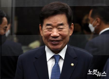 김진표 신임 국회의장이 5일 오전 서울 여의도 국회로 첫 출근하며 환하게 웃고 있다.