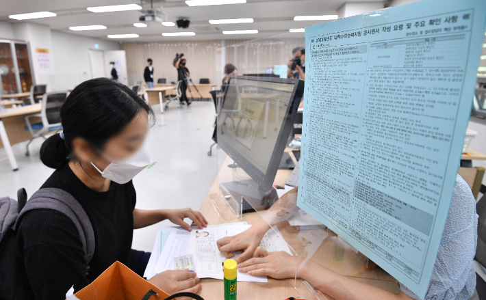 18일 오전 서울 성동구 성동광진교육지원청에서 수험생들이 2023학년도 수능 원서 접수를 하고 있다.
